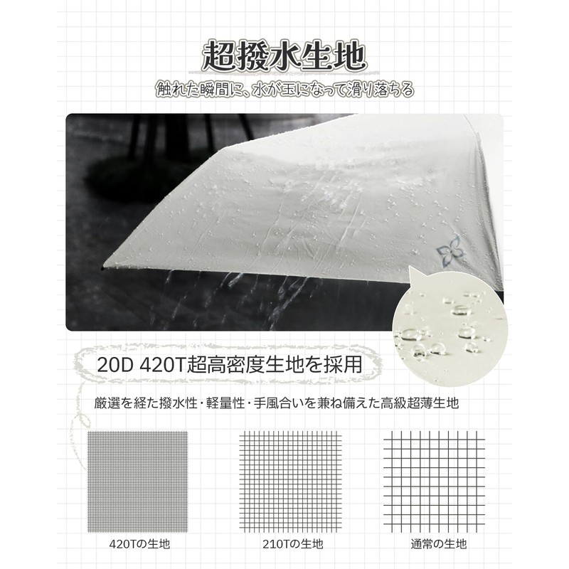 • 「超軽量&コンパクト」50cmのサイズでありながら、5本骨構造で驚異の軽さ105gを実現。収納時は直径2.5cmのスリムさでバッグにもすっきり収まるのに、広げれば日傘或いは急な雨に対策傘として使える実用性を備えています。20D 420T超高密度生地と超薄コーティング、さらに超軽量カーボン素材を採用することで、耐久性を損なうことなく、極限まで軽量化を実現。日傘としても雨傘としても、快適な使い心地を提供します。