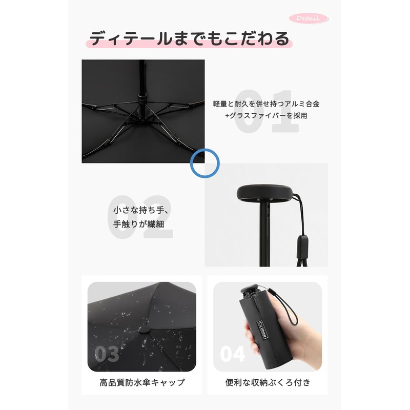 - Rain or Shine, Water Repellent Treatment: Made with 210T high-density water repellent material, the rainwater will roll down like a beads, and shake it off with a light shake. After use, simply shake the umbrella after use and it can blow out most of the moisture remaining on the surface. If you keep it in your bag or car at all times, it can be used in both sunny and rainy conditions as soon as the sun gets strong or suddenly rained