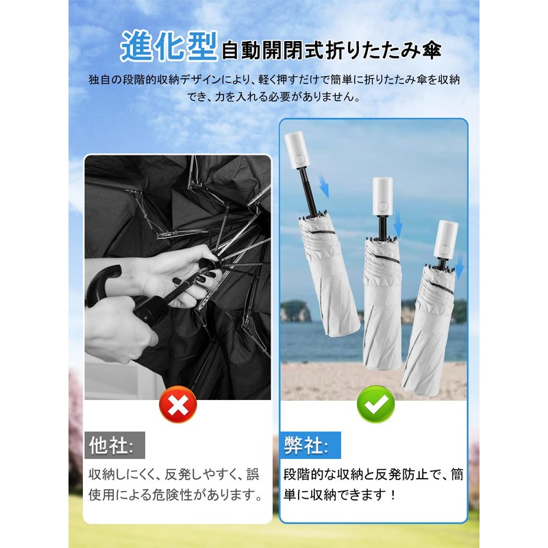(One-touch automatic open/close, lightweight & portable) The one-touch automatic open/close design allows for easy operation with one hand. It opens smoothly without force, making it easy to fold. Quick opening and closing with one hand when you get in and out of the house, convenient and efficient for all your busy daily activities. The compact and lightweight design allows it to be easily stored in your commuting bag or car, and it will quickly respond to sudden weather changes. A must have item that you can always rely on on on sunny or rainy days!