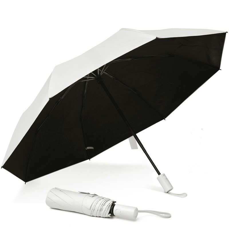 - (Can be used in both shine/rain & 8 ribs with strong construction) This folding umbrella is made of high density 210T waterproof material and has excellent waterproof performance. Heavy duty 8-rib design for increased strength and superior wind resistance. Safe to use even in strong winds. In addition, the umbrella surface has a wide area, which can effectively block the sunlight, prevent rain, and provide protection in all directions including your belongings