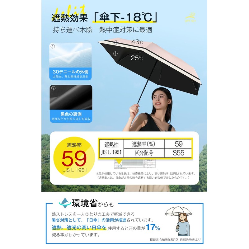 - (100% UV Protection, Full Blackout) Adopts a multi-layered fabric design that bonds the blackout film to the fabric, which has been JIS certified to block out light and has a 100% UV protection rate. The dual coating ensures that the front side completely blocks out direct sunlight, while the back side is black to keep light out and prevents the ground from hitting your face while reducing glare. By cutting the sun's rays from the heat rays by keeping the sun in the sun, it reduces the heat as if you walk in the sun, making it an indispensable item for summer during the hot season