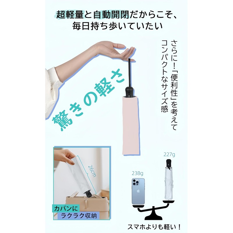 • Ultra Lightweight 8.9 oz (227 g), Easy to Carry: Even though it is an automatic folding parasol, it uses glass fiber and aviation aluminum alloy ribs, it has a weight of 8.0 oz (227 g). Lightweight like a smartphone, easy to carry. Comfortable for both kids and adults. Suitable for commuting to work or school, traveling, business trips, etc