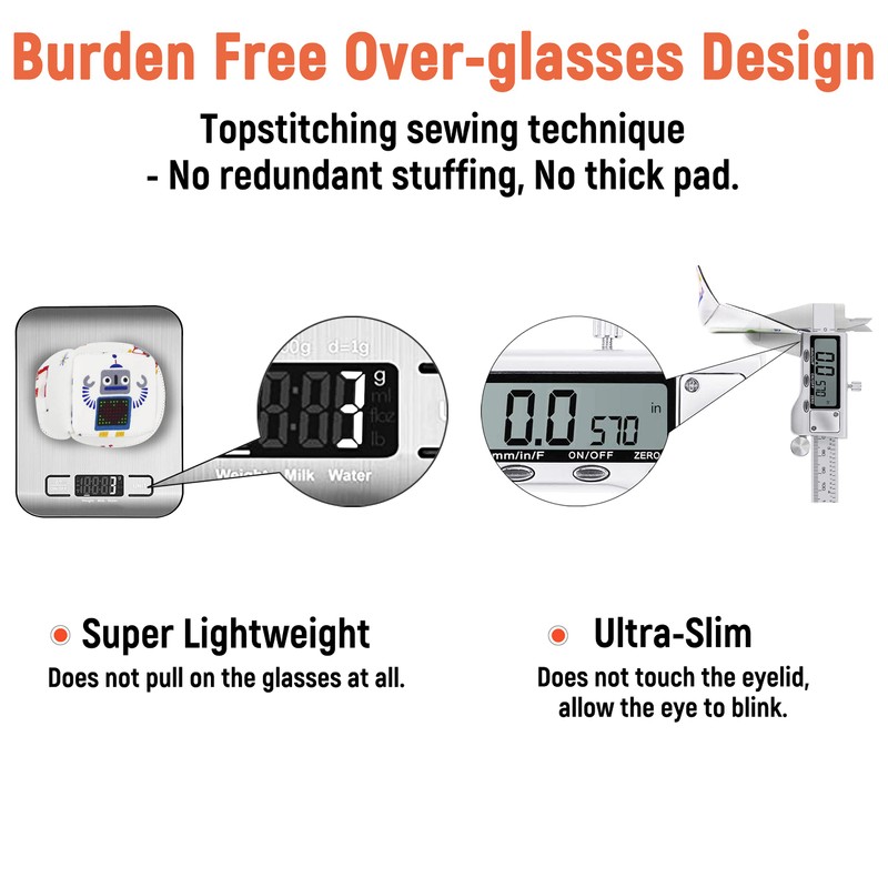 - ✅ Diseño superligero sobre gafas: no tira de las gafas en absoluto, ninguna almohadilla gruesa toca el párpado.