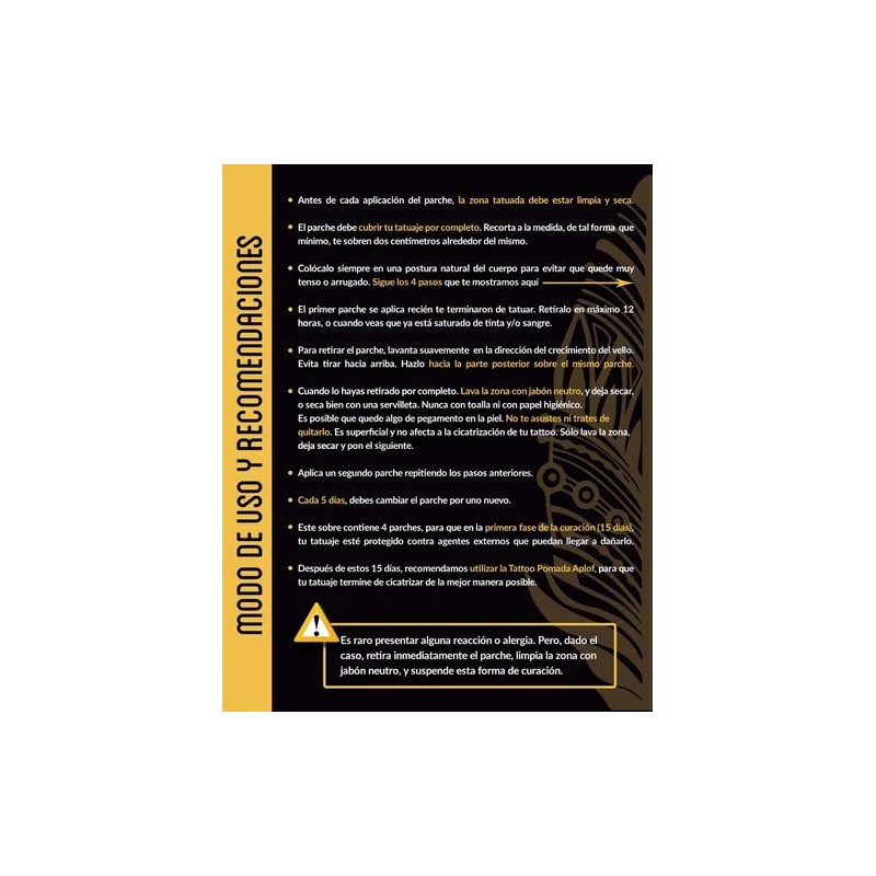 El primer parche se aplica recién te terminaron de tatuar. Retíralo en máximo 12