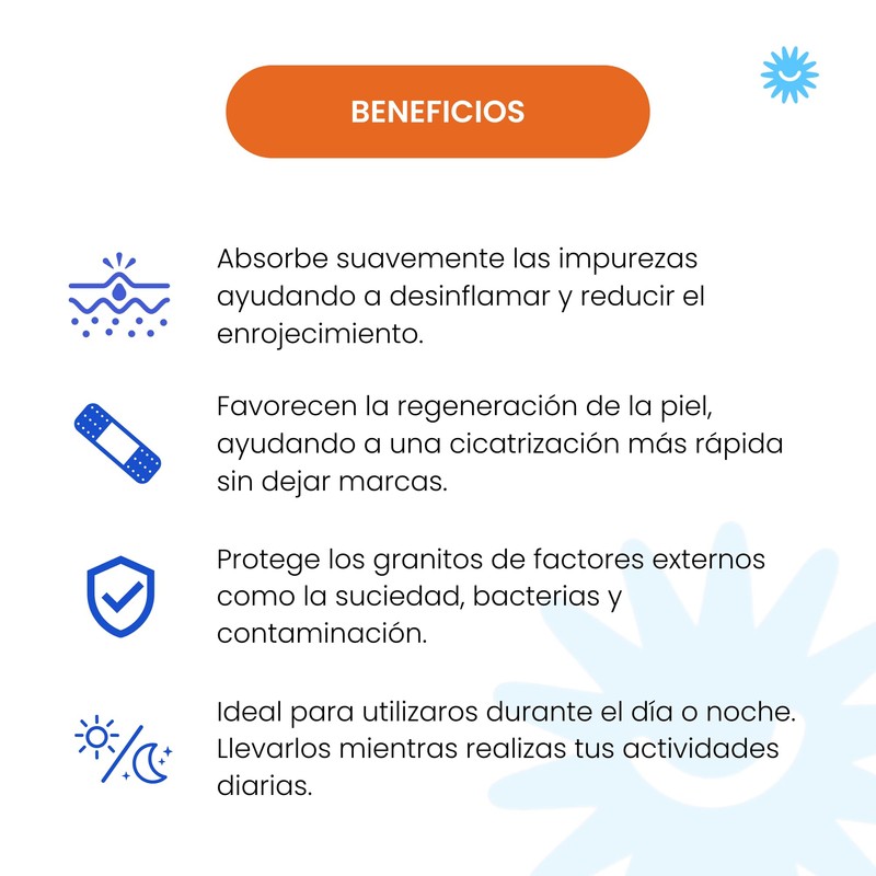 - EFECTIVIDAD: Absorbe suavemente las impurezas, humedad, aceite, pus y sudor. Ayudan a desinflamar y reducir el enrojecimiento, promoviendo la regeneración de la piel.