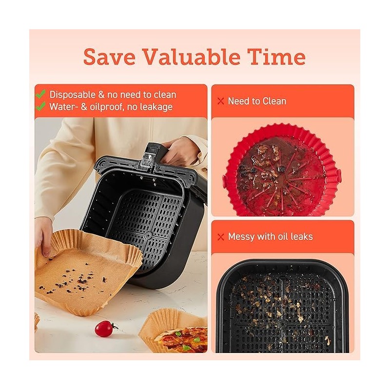 - This air fryer disposable paper liner can protect the inside of your air fryer, effectively prevent food debris from entering, simple operation, easy to remove food, clean and tidy, can save you time and effort. Make cooking easy and it will be a good helper in the kitchen.