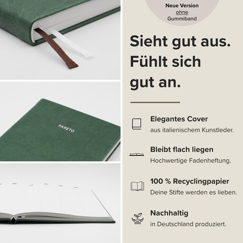 - Sustainable and climate-neutral produced in Germany: elegant cover made of Italian faux leather, premium recycled paper (ink resistant), awarded with the Blue Angel, perfect opening behaviour thanks to high-quality thread binding, with 2 bookmarks, format: planner, calendar, A5