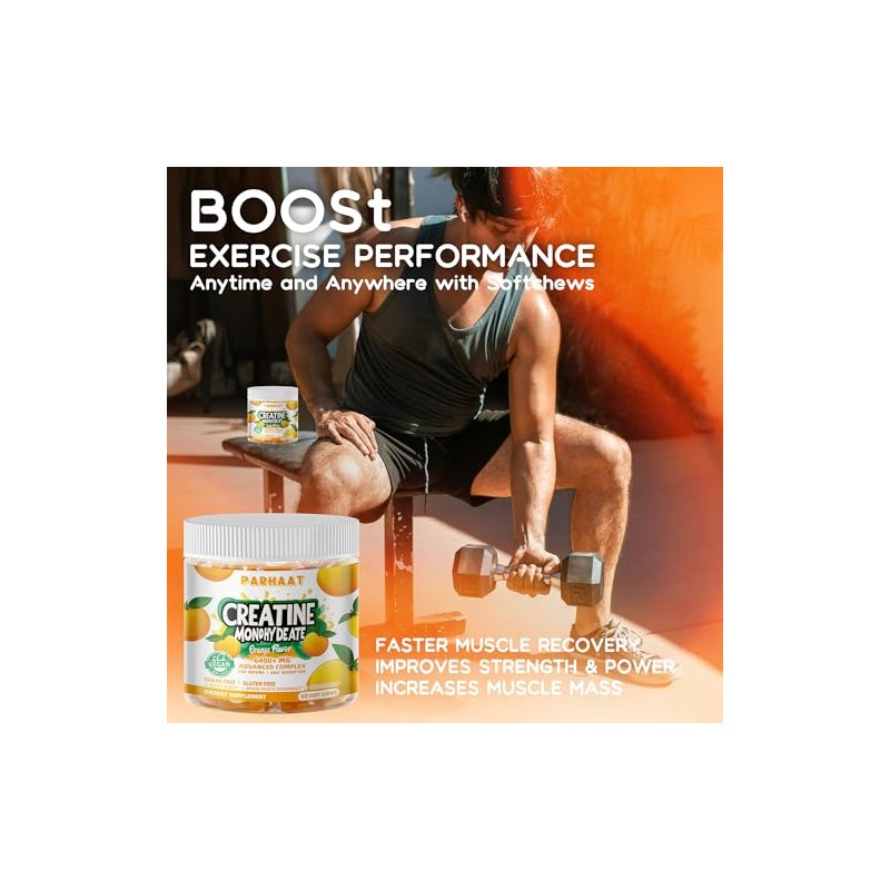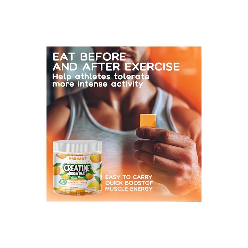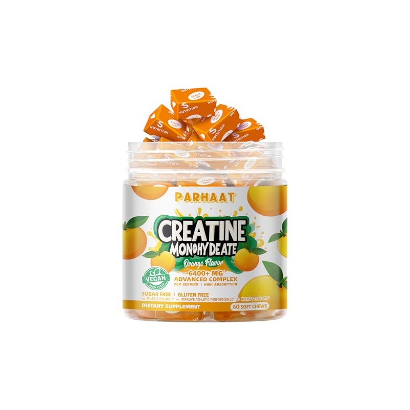 Parhaat Creatine Monohydrate Chews Complex 6400mg for Men & Women -Advanced Formula W/L-Taurine + Vitamin B12, Sugar Free Chewable Supplement,60 Orange Softchews