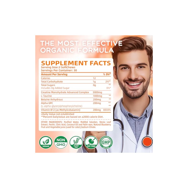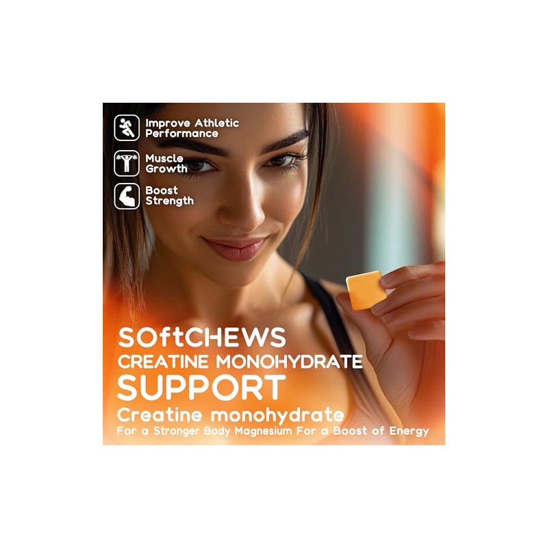 - [Premium Formula,Maximum Efficacy]: Our Creatine monohydrate Soft Chews contains 5g=2 Chews pure creatine monohydrate per serving combined for Maximum Benefits.