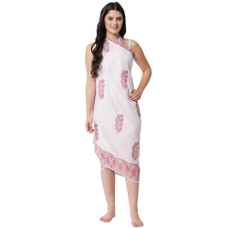 Fine quality hand block printed soft cotton sarong or pareo/beach wear.Sanganeri is a hand-block printing technique originating from Sanganer, a village in the southern part of Jaipur, Rajasthan. Crafted out of fine Mulmul Cotton fabric, it is lightweight and a picture perfect swimsuit cover-up at your next beach vacation. It also does double duty as a stole to add a pop of colour to a day dress or a jeans and tee-shirt look. The wrap has been hand block printed with an array of mughal arts.