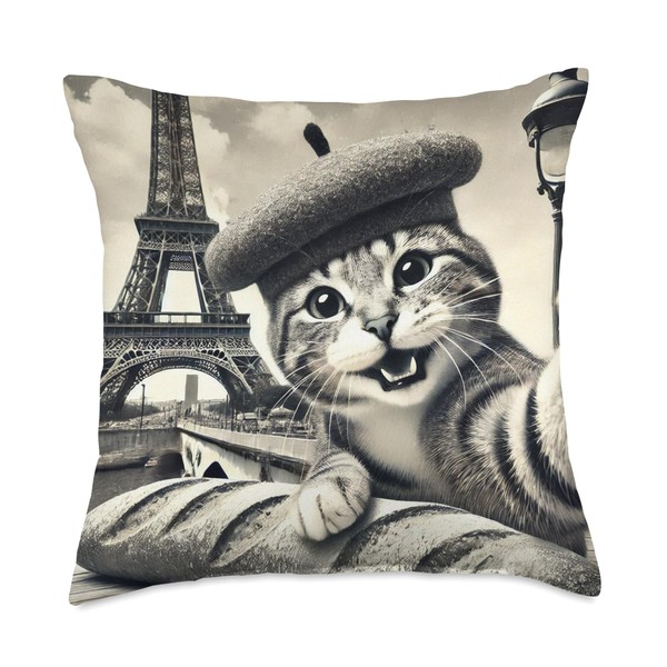 Paris Cat in Beret with Baguette Funny Eiffel Tower Throw Pillow