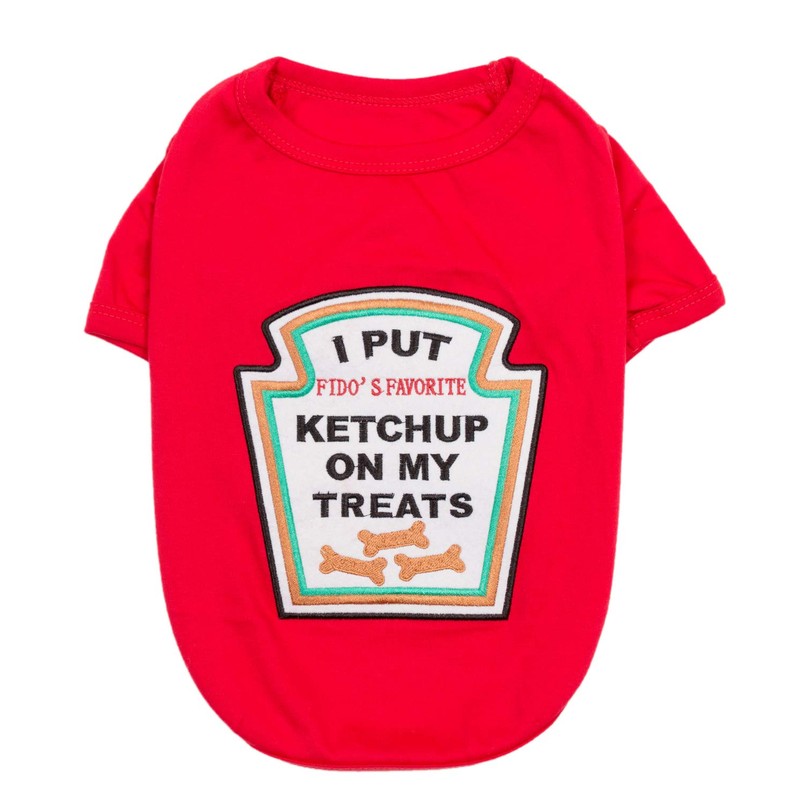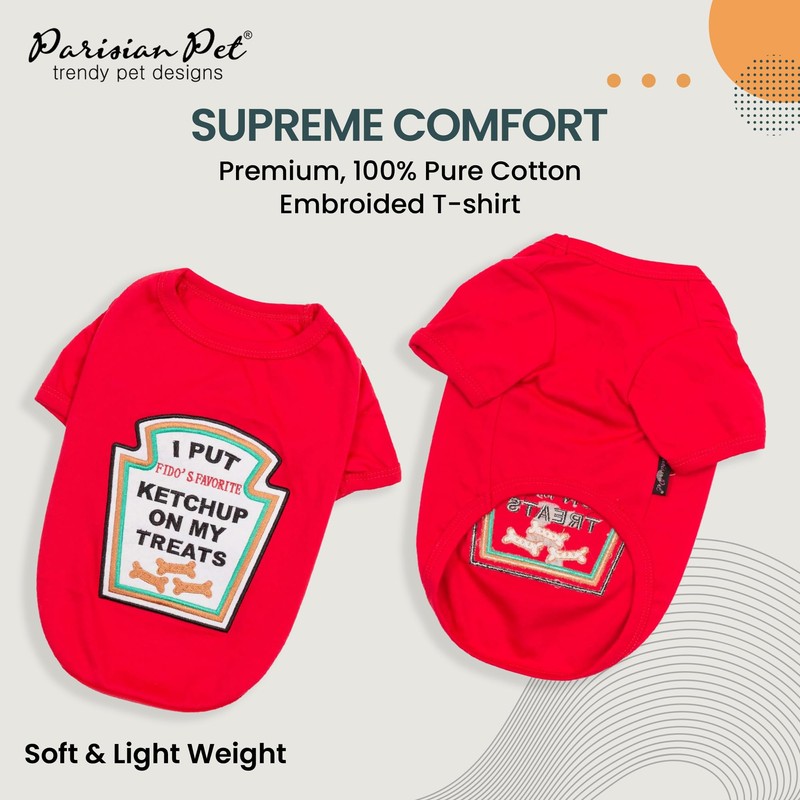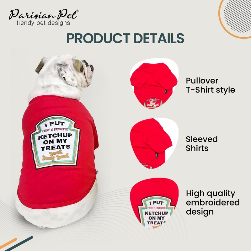 Parisian Pet Dog Shirt - Embroidered “ I Put Ketchup on My Treats “ - 100% Cotton & Polyester Pet Clothes - Sleeved Pet Dog T-Shirt - Red Dog Costume for Large Dogs 3XL