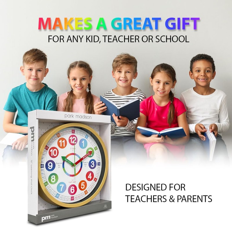 Park Madison 12 Inch Kids Learning Clock - Silent, Non-Ticking, Teaches Analog Time - Ideal for Bedrooms, Classrooms, Gifting