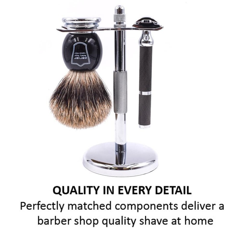 - Contains Parker's 71R safety razor, deluxe pure badger bristle brush and stand