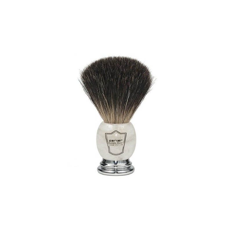 Parker Safety Razor Black Badger Bristle Shaving Brush with Off-White Marbled Handle & Free Stand