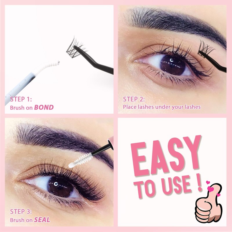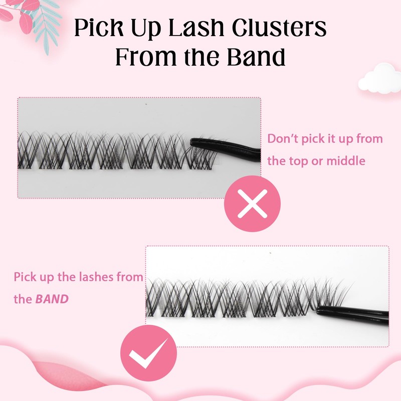 - Instructions: Pick up the cluster eyelashes from the BAND of clusters. Apply individual lash glue and wait for 30 seconds. Then wear the lashes below your own lashes. So easy to finish the lash extensions. [Remind: stack the cluster lashes with other strip lashes to get a fuller look.