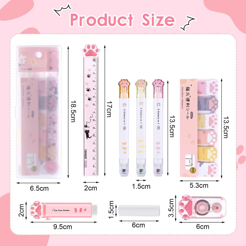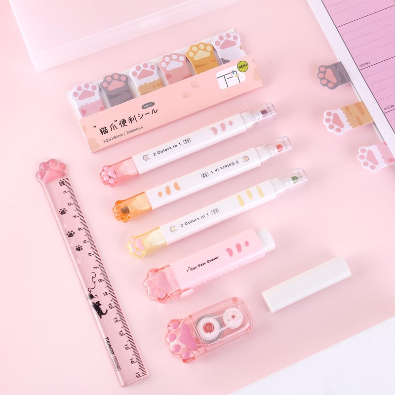 - Cat Paw Stationery Set : You will receive 9pcs cute cat paw stationery set, including 1pcs retractable eraser, 1pcs eraser replacement Core,1pcs ruler, 3pcs double-ended highlighter, 1pcs cat paw correction tape cube, 1 plastic storage box, and 120 sheets of sticky memo notes