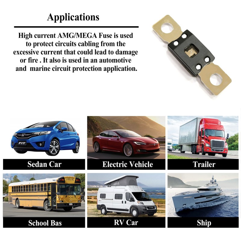 - Screwable MEGA/AMG fuse to protect high current circuits that protect the vehicle's electrical system or electronic accessories from short circuit and overload.
