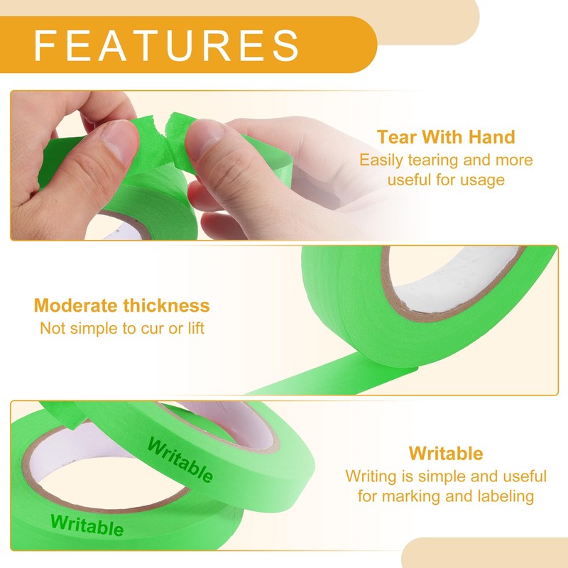 - [PRODUCT FUNCTION] The masking tape uses a good glue ratio to achieve the correct viscosity, which can stay indoors for about 14 days, suitable for kinds of surfaces, such as plastic, glass, paper, whiteboard, painted walls, and cars.