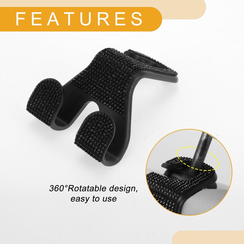 Partuto 2 Pcs Universal Car Seat Headrest Hook for Most Car, SUV, Truck Car Seat Back Organizer Hooks Sturdy ABS Rhinestone Black 2.56"x2.83"