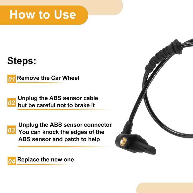 • How to use: Easy Installation.Remove the car wheel, unplug the ABS sensor and sensor connector, then replace the new abs sensor.