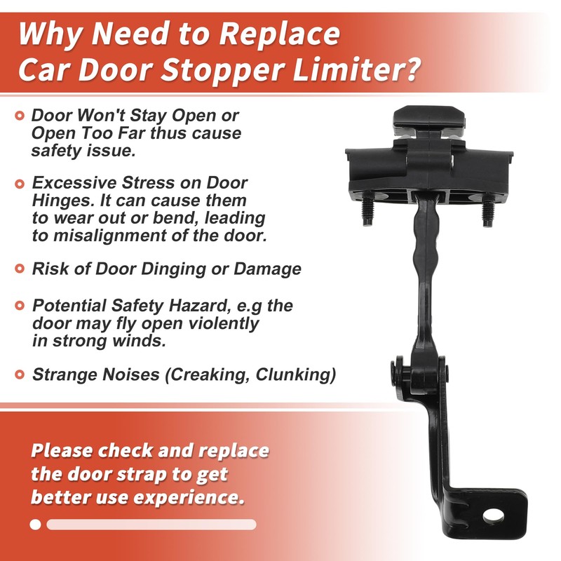 - [Function] The door check bracket will be aging, cracking, rusty connector etc. after long-term use, and the install hole of bracket may turn into egg shape thus effect door using. This door check strap can control the door opening angle thus to avoiding excessive collision with objects when opening door, Well keeps door open and avoids door slamming on your legs when trying to get out of car.