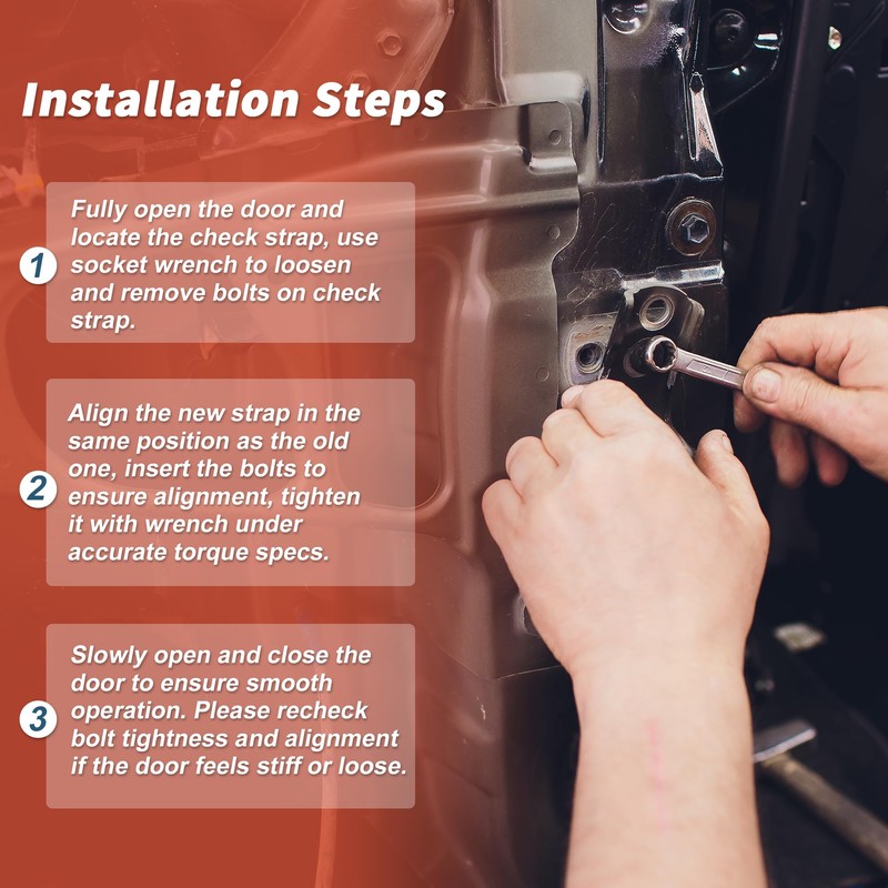 - [Installation of Door Stop] 1. Fully open the door and locate the check strap, use socket wrench to loosen and remove bolts on check strap. 2. Align the new strap in the same position as the old one, insert the bolts to ensure alignment then tighten it with wrench under accurate torque specification. 3. Slowly open and close the door to ensure smooth operation. Please recheck bolt tightness and alignment if the door feels stiff or loose.