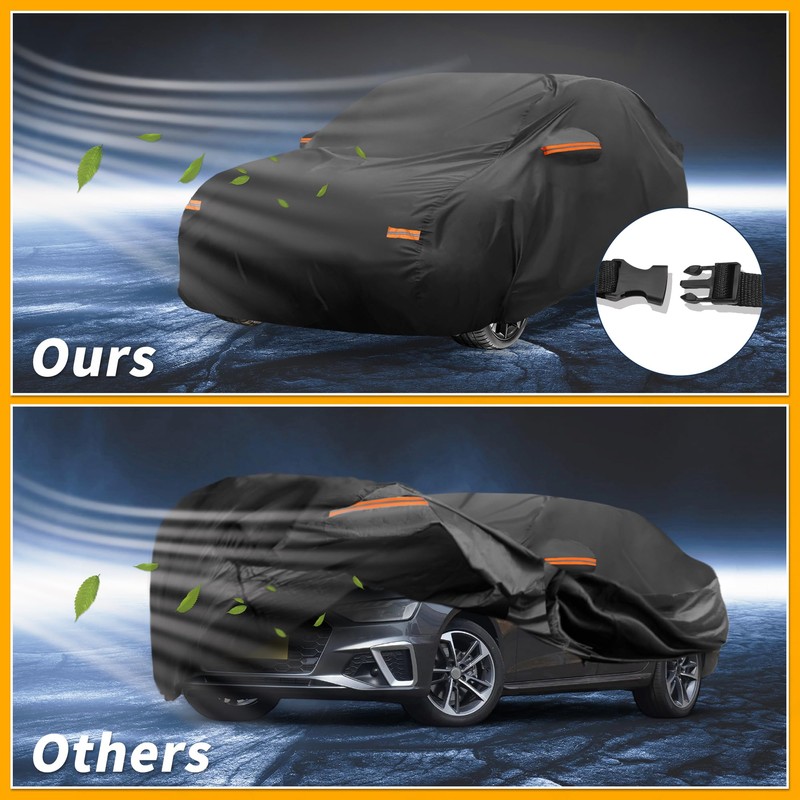 - [SIMPLY TO USE] The reflective strips in the car cover enhance nighttime visibility and parking safety. For added convenience, the right-side door zippers allow for easy access to the interior without the hassle of removing the entire cover, saving time and effort. The windproof elasticized hem around the wheels is designed to firmly hold the car cover in place even on gusty days, ensuring that the vehicle remains protected from the elements
