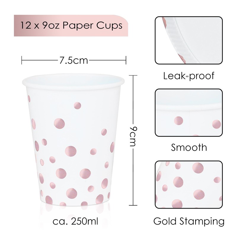 - Box contents: set of 12 disposable drinking cups, white with rose gold dots, 9 ounces, 250 ml, paper cups made of 100% paper, recyclable.