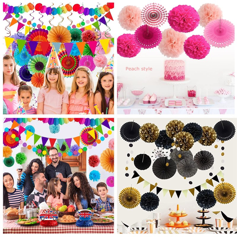 - 🌈 Great Value: These decoration set are made of premium paper material with bright color, safe and eco-friendly. It assorts with paper pom poms, honeycomb balls, fans with different size &color. Give a special touch to your party with this darling combination.