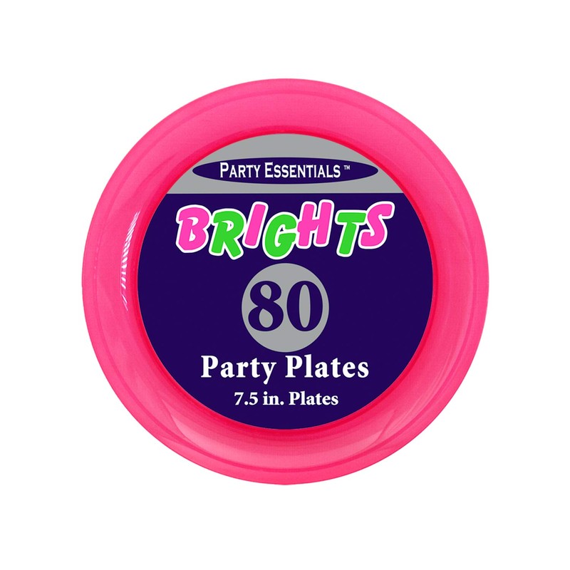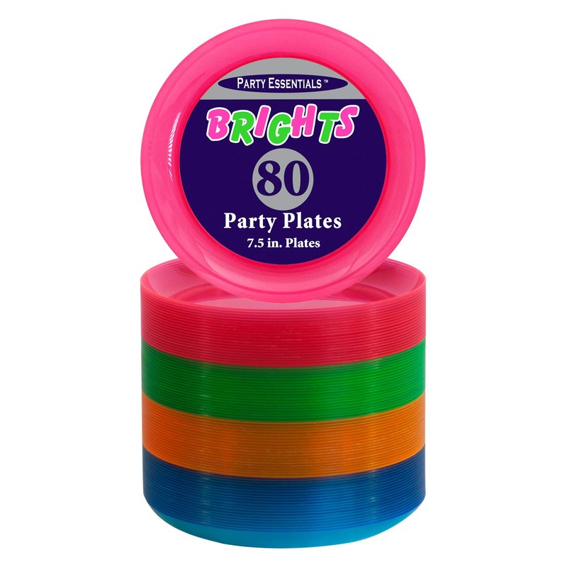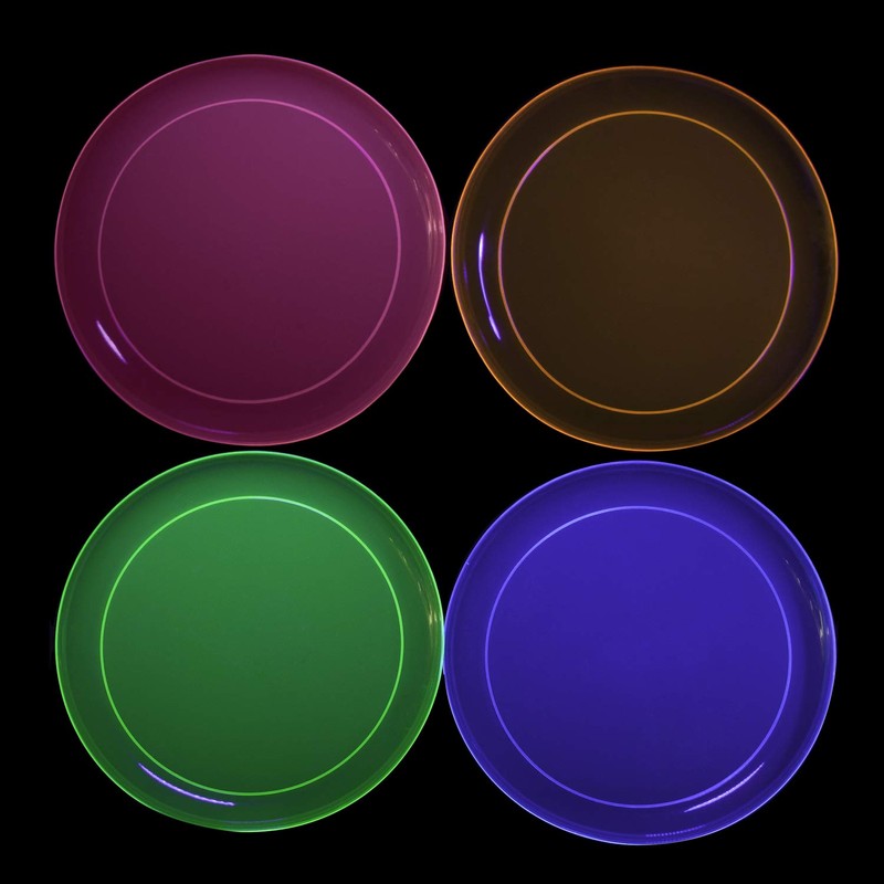 - Party Essentials Disposable hard plastic 7.5-Inch Neon Brights party plates feature traditional tableware styling and are colorful with or without blacklight. Plates are black light reactive.