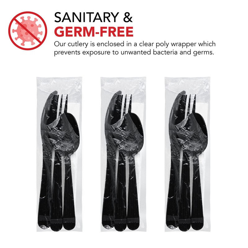 Party Essentials Individually Wrapped Black Plastic Cutlery Packets/Heavy Duty Silverware Kits, Fork/Spoon/Knife/Napkin, 100 Sets