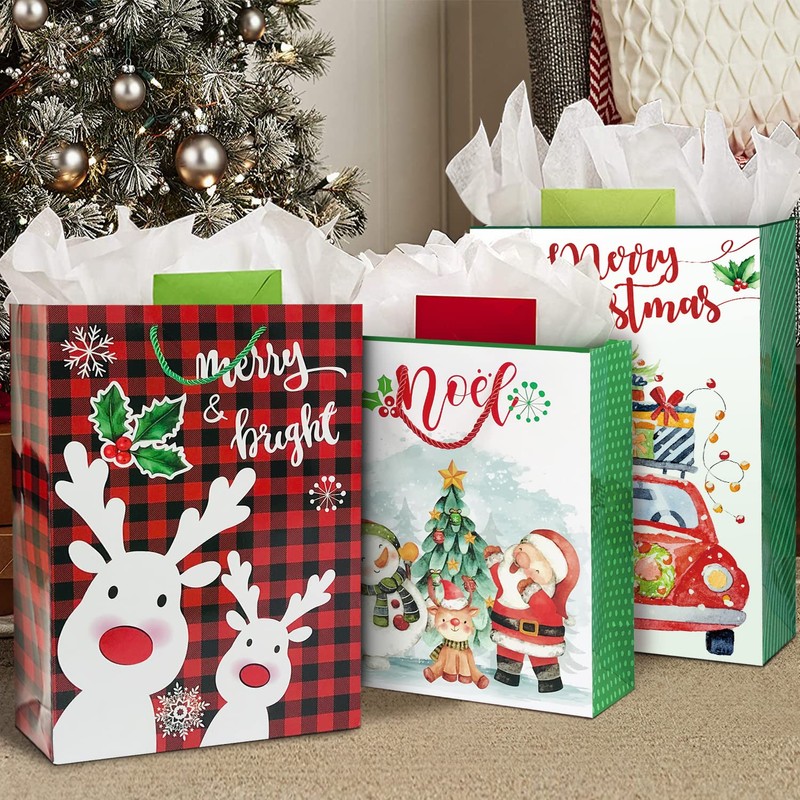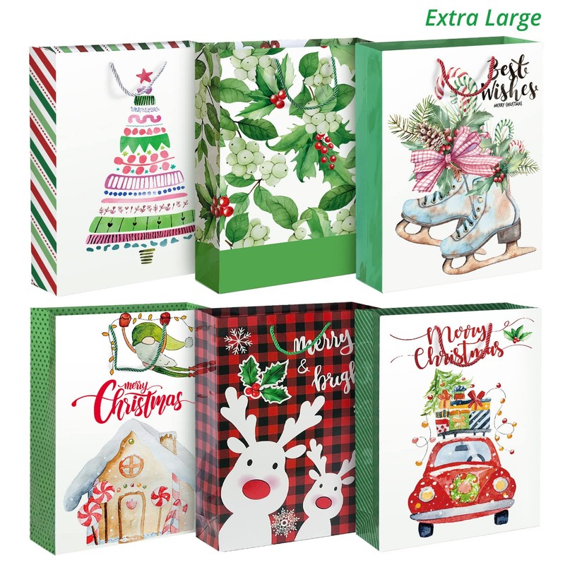 - Our Xmas Gift Sacks Bulk Includes 6 Jumbo 6 Large 6 Medium and 6 Small Gift Bags! This set includes more large bags than other such similar sets.