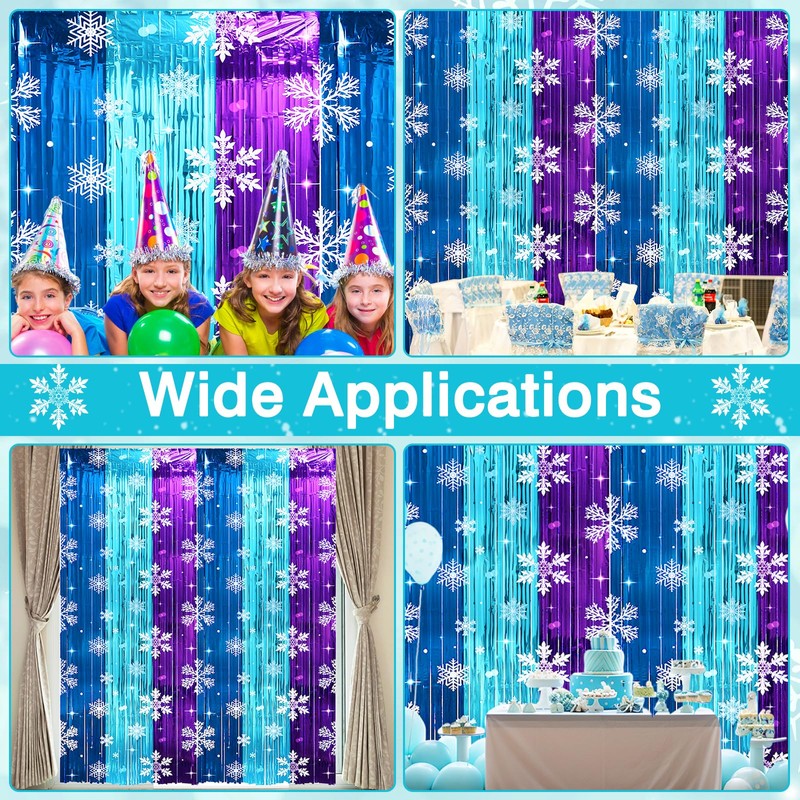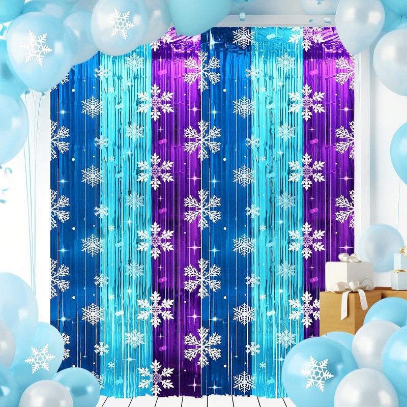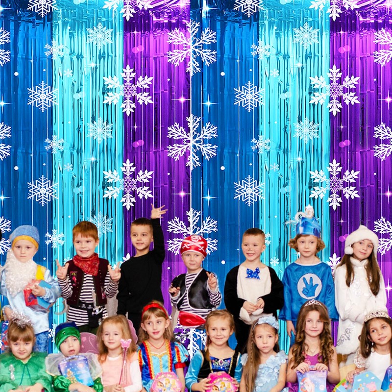 - Package includes: You’ll get 2 packs of 3.3ft x 8.2ft snowflake foil fringe curtains backdrop streamer in blue and purple. Designed to bring a touch of frosty magic to any event, these snowflake photo booth props curtains are ideal for snowflake birthday parties, winter wonderland decorations, or as a stunning backdrop for photo booths.