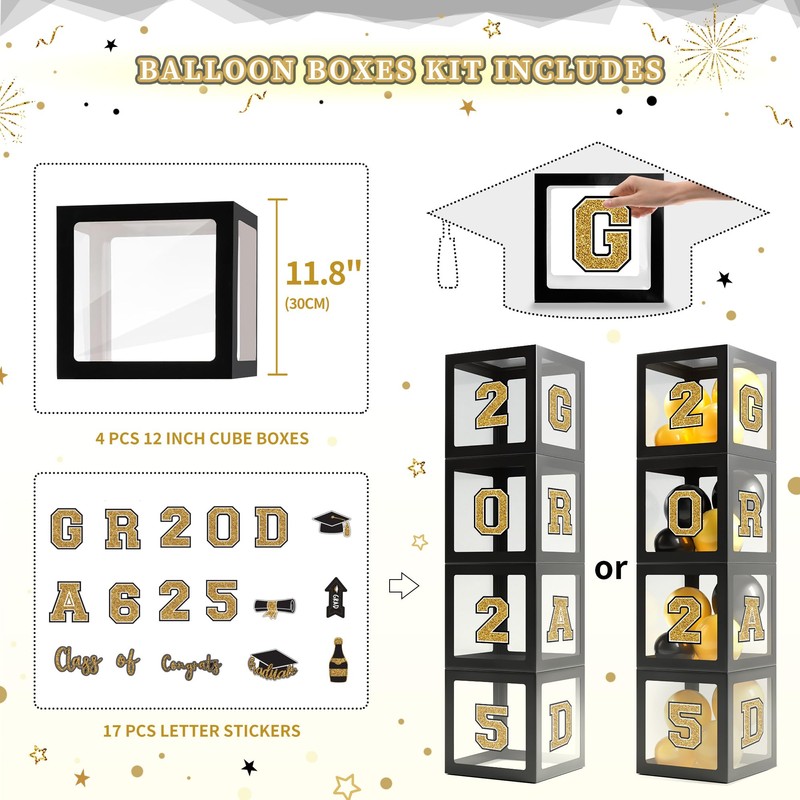Party Spot!2025 Black and Gold Graduation Party Decorations,124 PCS Graduation Decorations Class of 2025,4 PCS Balloons Boxes with LED Light String & Letters 2025 GRAD So Proud of You