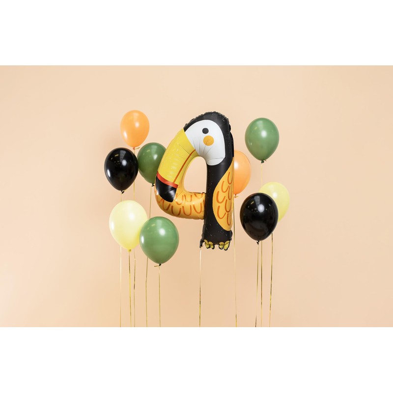 - Product: Toucan balloon in the shape of the number 4 / contents: 1 number balloon / size after inflation: 47 x 80 cm / material: plastic - foil / colour: black - yellow - white - orange