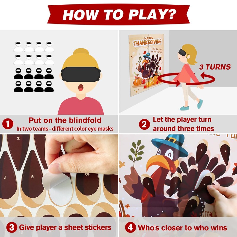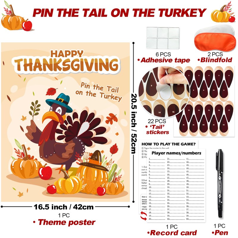 - THANKSGIVING GAMES FOR FAMILY - Includes thanksgiving theme poster(16.5x20.5 inch), ‘tail’ stickers for 22 guests, white and orange blindfold, 6pcs adhesive tape, record card and pen.
