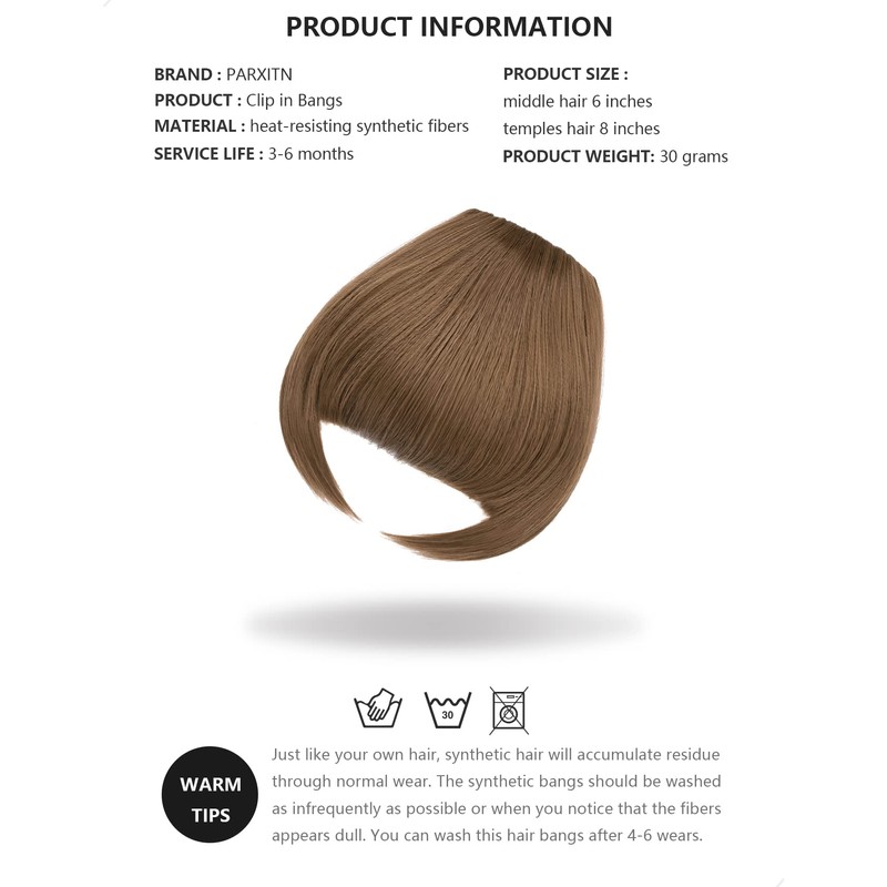 - Sturdy clip-in ~ PARXITN Bangs hair extensions with two invisible clip-in designs make it easier to put on/off and would stay for a long time without falling out. Pony is thick (30 grams) and neat, the middle is 6 inches (15 cm) long, the temples are 8 inches (20 cm) long