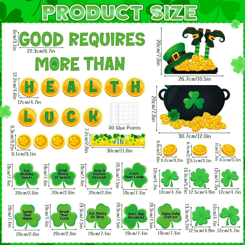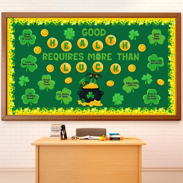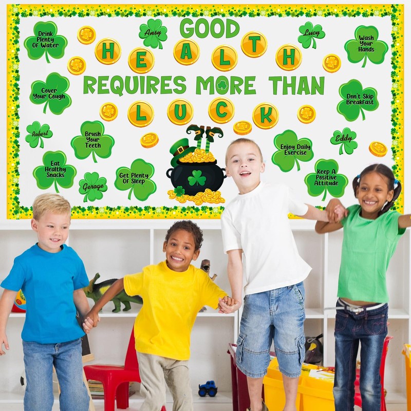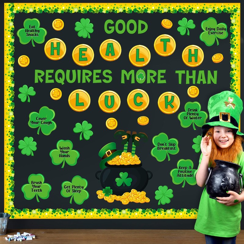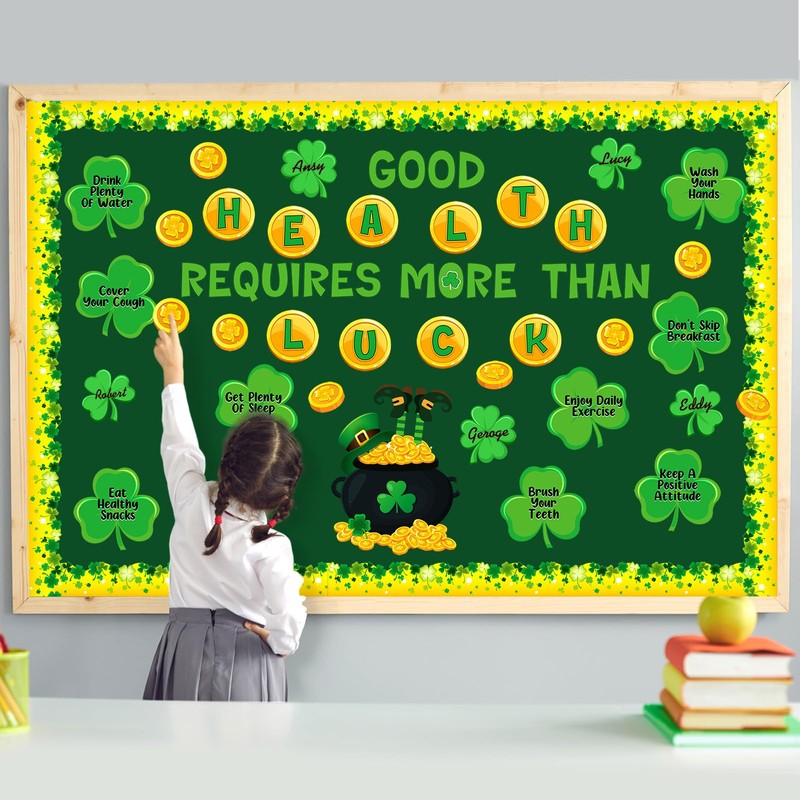 • St. Patrick's Day Bulletin Board: our St. Patrick's Day classroom bulletin board decorations are designed in classic Irish clover elements, with words of [GOOD HEALTH REQUIRES MORE THAN LUCK]; Bringing you a chic St. Patrick's Day classroom
