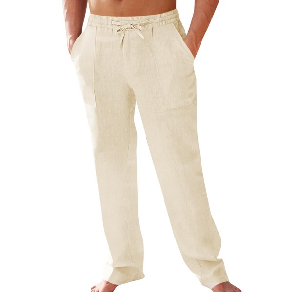 PASLTER Men's Cotton Linen Pants Elastic Waist Drawstring Casual Trouser Lightweight Straight-Legs Loose Beach Yoga Pants Beige