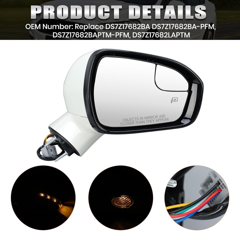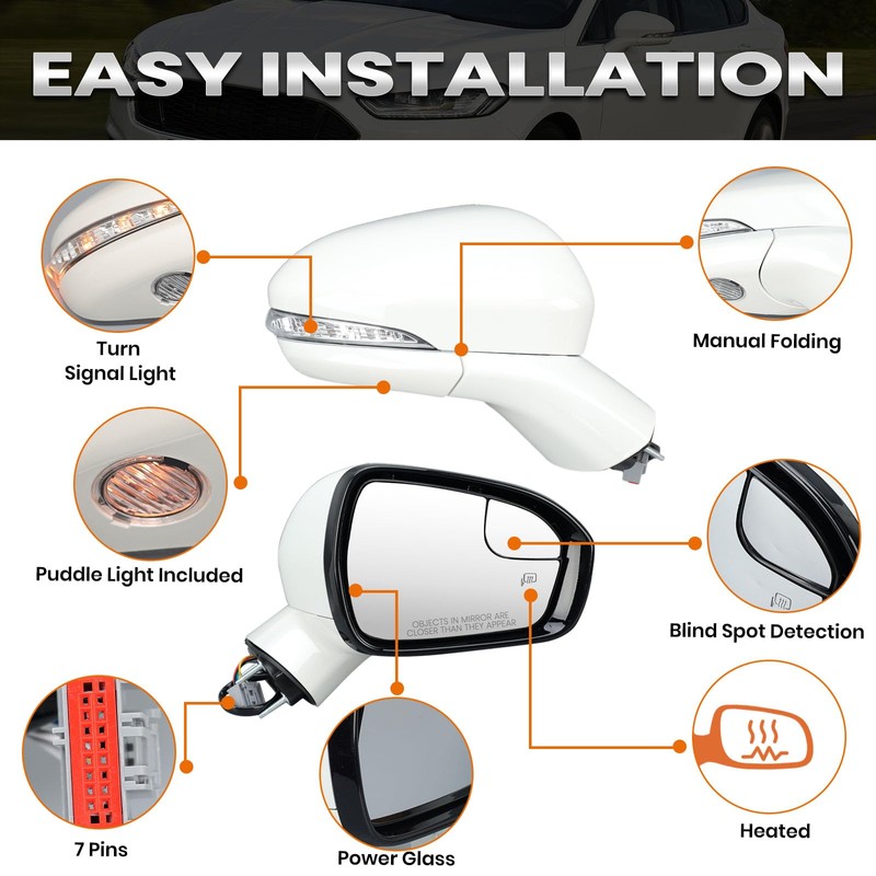 • Features: Heated | with Turn Signal Indicator | Power Glass | with Blind Spot Detection | Puddle Light | Manual Folding | Pearly White | 7 Pins