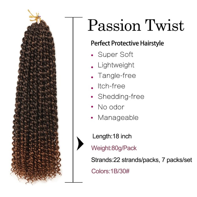 - - Hair material: 18 inch (45.5 cm) water wave passion twist hair, 100% high quality low temperature fibre Kanekalon synthetic fibre. Weight: 22 - 20 strands/pack. 80 g/pack. 7 packs/set