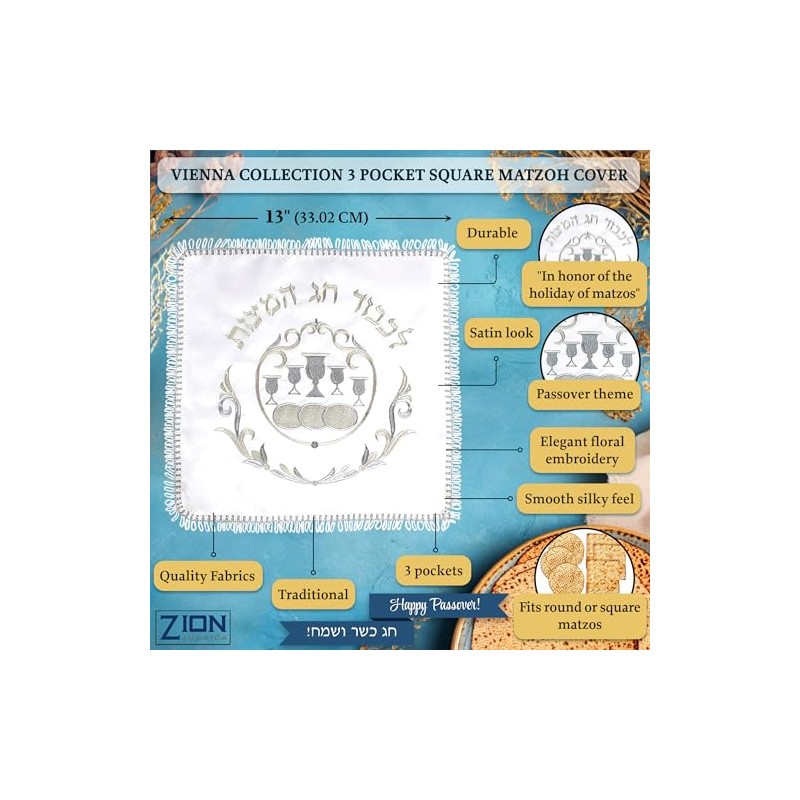 - Smooth Silk feel Designed with class in 2-tone silver colors the Matzah cover comes embroidered with the words in hebrew "לכבוד חג המצות" which translate to In honor of the holiday of matzos, and features four cups of wine and 3 Matzot with an elegant floral pattern.