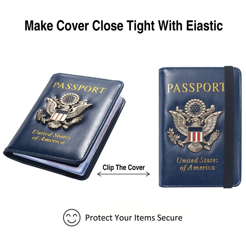 - PREMIUM LEATHER: Passport holder are made from high-quality ECO-Friendly PU texture leather, touch soft and comfortable, high tensile strength; Comes with an elastic strap which can secure items inside and you can clip the passport, Credit cards , money , SIM cards, air tickets, boarding pass and more, passport cover will not open in your bag.