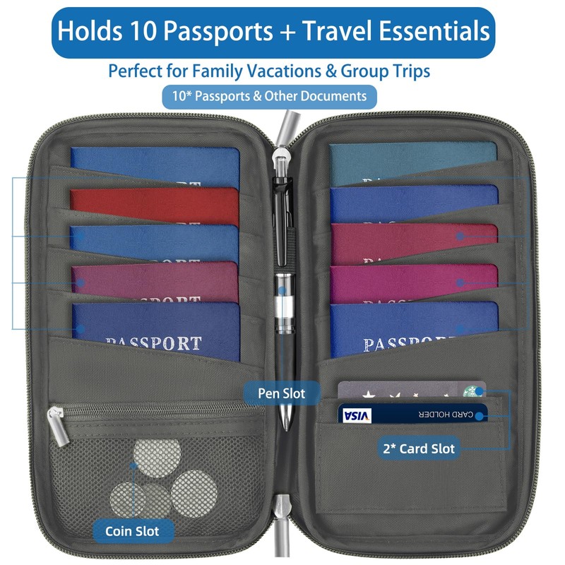 - Document Holder for Traveling: RFID-blocking Family Travel Document Organizer doubles as a travel pouch for passport and documents, and travel passport wallet. Securely stores IDs, cards, & essentials. Perfect family passport holder for trips & events. Includes removable wrist strap.