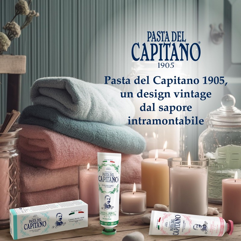 • Vintage toothpaste - Pasta del Capitano 1905, has always been synonymous with safety and quality made in Italy. Elegance and Italian tradition: these are the words that best describe the stylistic character of the Pasta del Capitano brand.