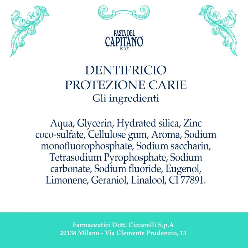 • PASTA DEL CAPITANO 1905 - Pasta del Capitano was born in 1905 in the pharmacy of the Ciccarelli family and represents a real revolution in the field of daily oral hygiene. A toothpaste in paste form and not in powder form, an innovative product based on carefully crafted specific formulations, with pharmaceutical precision and a purely Italian passion. A value that has remained constant to this day.