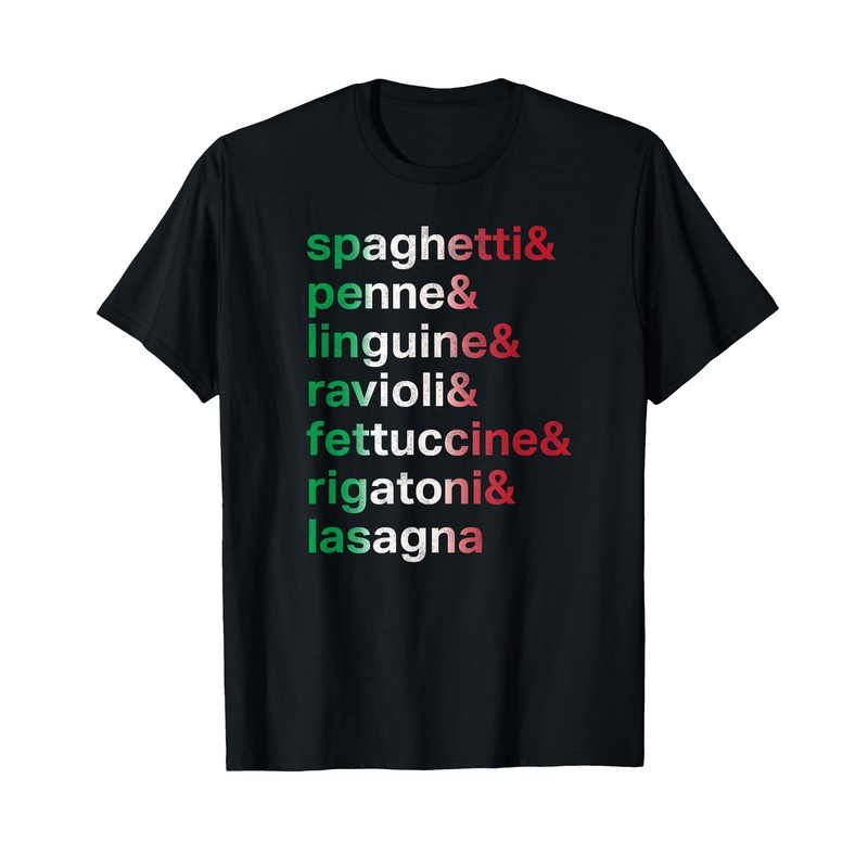 - Pasta Carb lover tshirt has cool distressed design with list of different pastas in colors of green, white, red of Italian flag. Great gift for Italian food lover, chef, foodie, carb loader, runner, waiter in Italian restaurant.