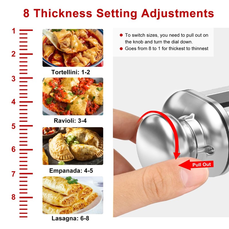 - 🍀[𝟖 𝐆𝐞𝐚𝐫 𝐀𝐝𝐣𝐮𝐬𝐭𝐦𝐞𝐧𝐭𝐬] 3-Piece Pasta Maker Attachment Set has an 8-gear adjustment knob from 0.4 to 2 mm (0.016 to 0.08 in) to adjust the desired thinness of the pasta in order to change the texture and taste of your pasta. Simply adjust the knob to the desired function and slide the dough through the appropriate slot.