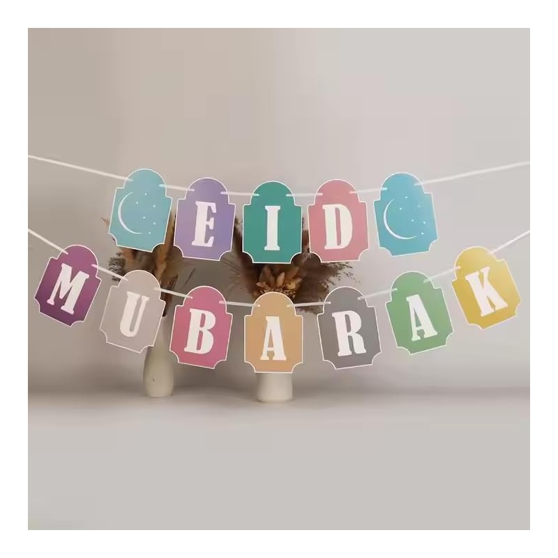 Pastel Eid Mubarak Bunting Decorations -Banner, Flags Hanging Decor for Home Domes Lanterns Moon